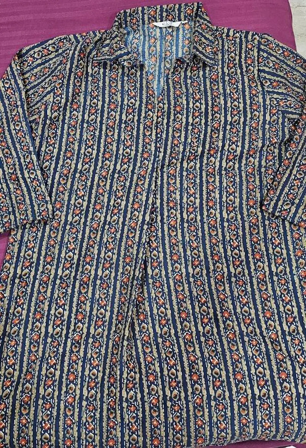 Make a stylish statement with this navy blue printed longline shirt top from U&F Beyond, crafted especially for plus-size women. Designed in soft breathable crepe, this top combines comfort with elegance. The vertical striped ethnic-inspired print adds a slimming effect, while the shirt collar neckline with a concealed button placket gives it a polished finish. Its longline A-line silhouette ensures a flattering fit for all body types, making it ideal for both casual and semi-formal occasions.