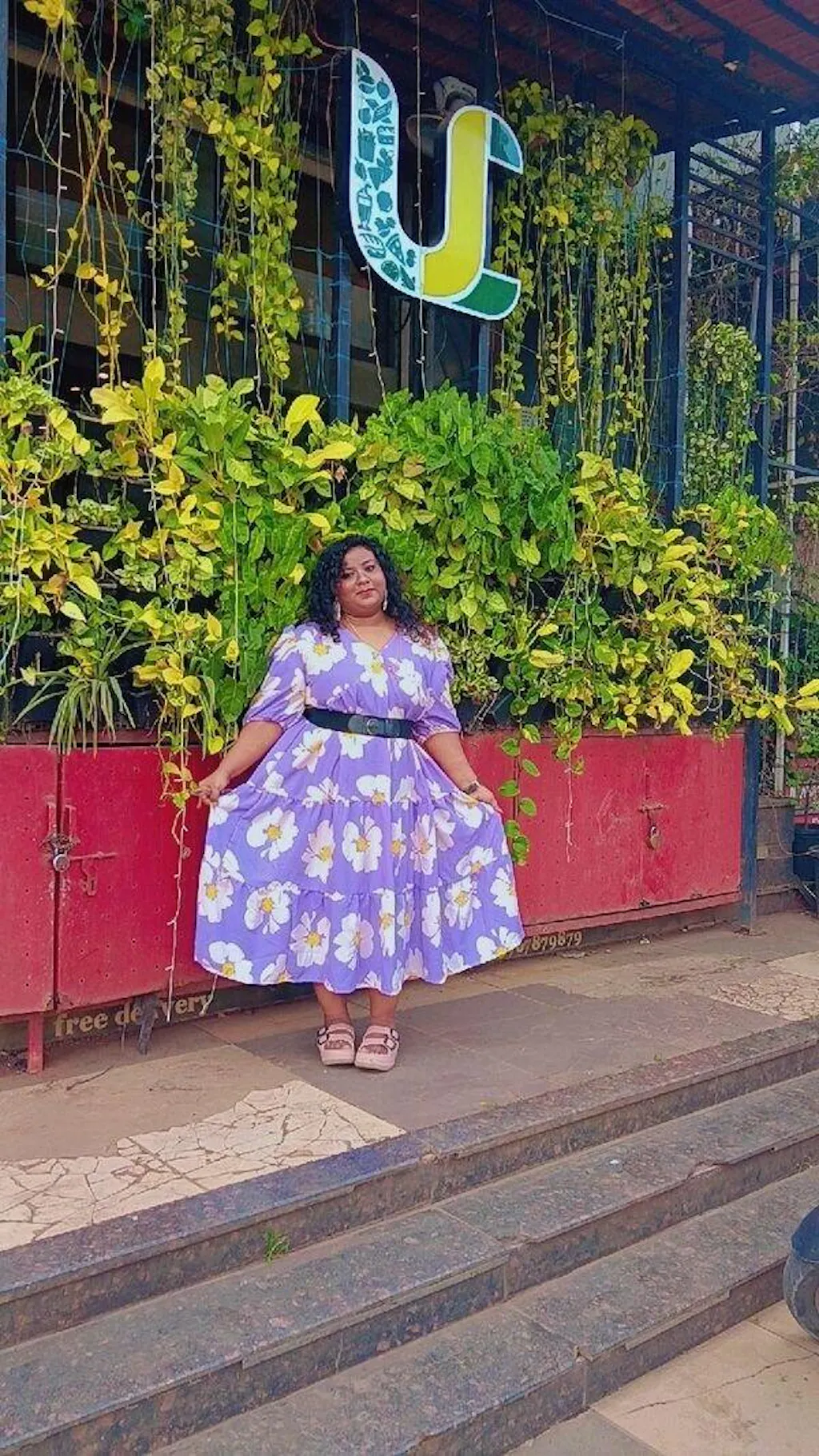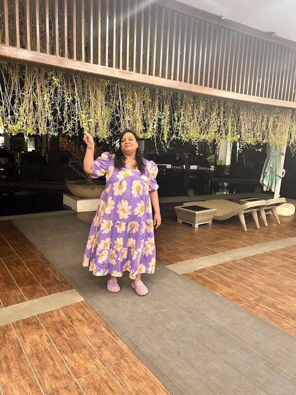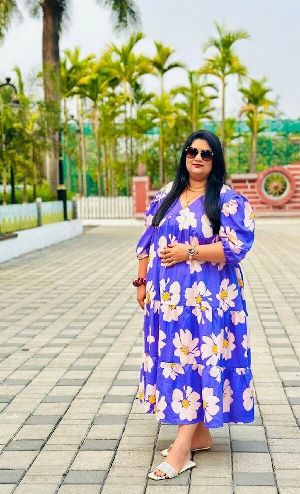 Step into effortless elegance with this lavender floral maxi dress from U&F Beyond. Designed in a flowy tiered silhouette, this piece combines comfort and femininity beautifully. Featuring a V-neckline, puffed half sleeves with elastic cuffs, and an all-over oversized white floral print, it’s a statement-making choice for vacations, brunches, and summer getaways. The airy cotton fabric ensures breathability and ease of movement for every occasion.
