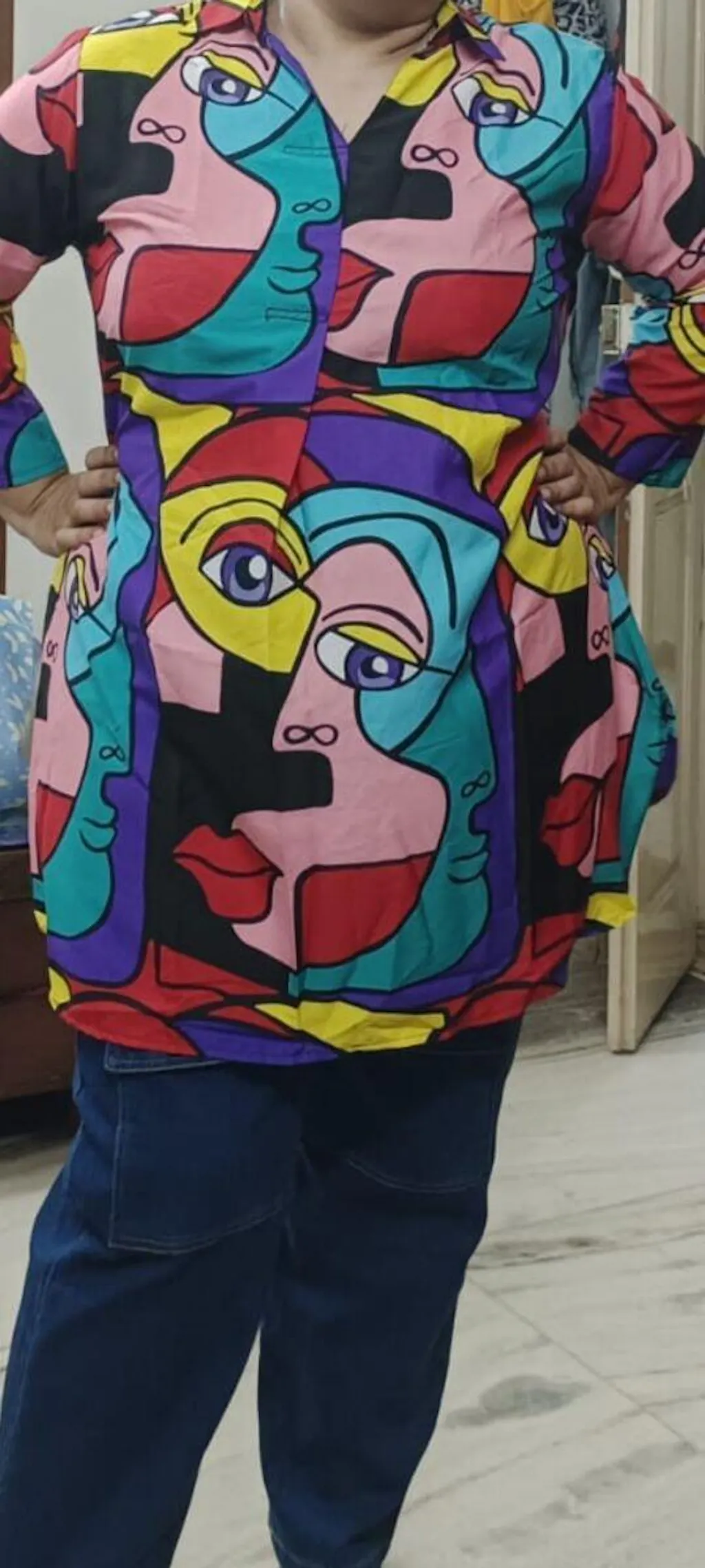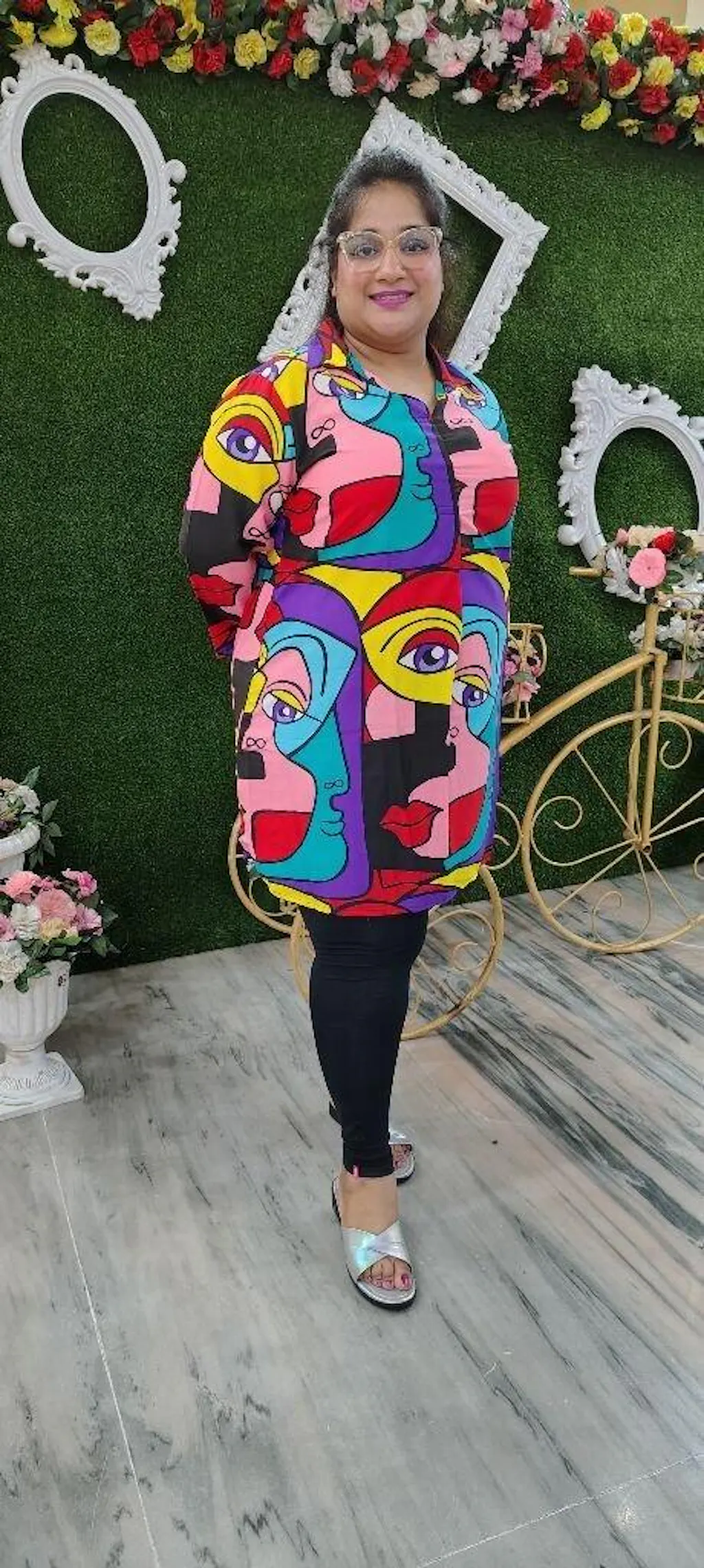 Women Plus Size Abstract Printed Crepe Shirt Style Longline Top